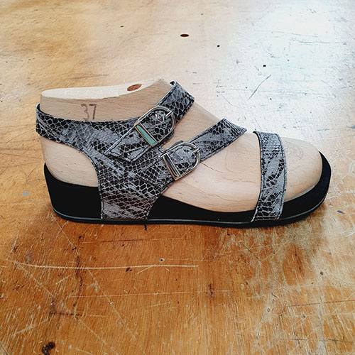 Een sandaal met een schuine band op de voorvoet en twee gespen.