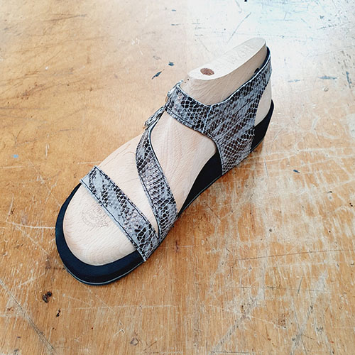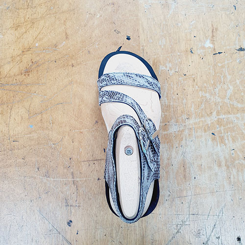 Een sandaal met een schuine band op de voorvoet en twee gespen.